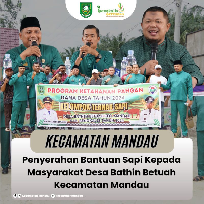 “Alhamdulillah pada pagi ini kita dapat menyaksikan bukti nyata bahwa banyaknya Program-program Unggulan Bermasa dibawah kepemimpinan Bupati Bengkalis Ibu Kasmarni, S.Sos., M.MP., yang insyaallah langsung menyentuh kebutuhan masyarakat dalam rangka untuk pengembangan ekonomi bagi masyarakat Desa Bathin Betuah, mari kita selalu menjaga kebersamaan dan kekompakan agar Desa Bathin Betuah yang kita cintai ini semakin Bermarwah, Maju dan Sejahtera dimasa yang akan datang”, ujar Camat Mandau Riki Rihardi, S.STP., M.Si.